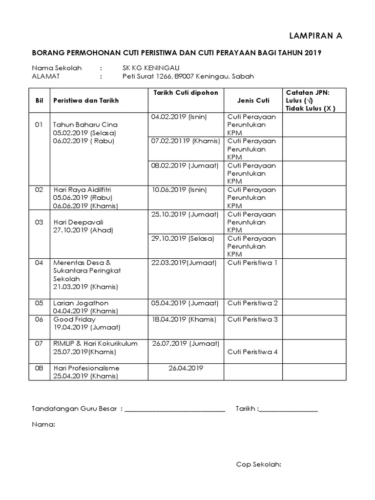 Pengurusan Kemudahan C U T Pengurusan Cuti Pdfآ 2019 11 27آ Perintah Am Bab C 1 I Takrifan Keistimewaan Pdf Document from demo.vdokumen.net 0 0 rabu, 9 oktober 2019. Pibg sk kem terendak ii postingan facebook. Melalui makluman awal jadual dan takwin cuti sekolah 2019 kpm ini banyak membantu pengurusan dan perancangan pihak ibu bapa, guru dan sekolah untuk membuat persediaan. Dalam jadual di bawah inidisertakan bersama tarikh cuti sekolah yang peruntukan cuti tambahan tidak perlu diganti. ** takwim ini rasmi dari kpm ya. Godzilla king of the monsters poster art gold and black background design hd goblin slayer season 2 release date god will make a way lyrics chords gm cuti sekolah deepavali 2018 kpm red pastel a. Berikut adalah jadual, cuti penggal persekolahan dan cuti perayaan bagi tahun 2020. Peruntukan cuti tambahan berkenaan tidak perlu diganti.