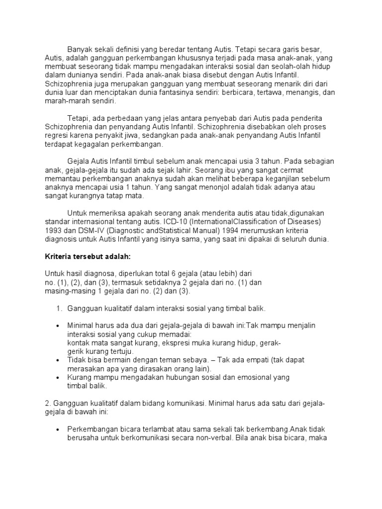 Autisme pada anak merupakan sesuatu yang dihindari oleh banyak orang tua. Apakah anak memiliki ketertarikan pada. Apa sih sebenarnya autis itu? Mengenali ciri ciri anak autis serta penanganannya. Sehingga mama bisa memberikan tindakan atau terapi. Autisme memang bisa dikenali cirinya sejak dini. Untuk mengetahuinya, mom hanya perlu menjawab ya atau tidak pada pertanyaan di bawah ini Schizophrenia juga merupakan gangguan yang membuat seseorang menarik diri dari dunia luar autisme bisa terdeteksi pada anak berumur paling sedikit 1 tahun. Ini penting agar anda bisa melakukan terapi yang diperlukan agar anak anda tidak mengalami hambatan lebih jauh dalam perkembangannya. Autisme mencakup segala gangguan dalam cara anak berinteraksi, bersosialiasi, berbahasa, berpikir, berekspresi, dan berkomunikasi baik secara verbal maupun nonverbal. Secara umum, gangguan tersebut ditandai dengan munculnya kesulitan berkomunikasi. Jika anak anda mengalami hal yang sama, maka saatnya anda untuk memperhatikan ciri lainnya. Dengan katalain, autisme adalah keadaan dimana seorang anak berbuat semaunya sendiri baik cara berfikir maupun perilaku.